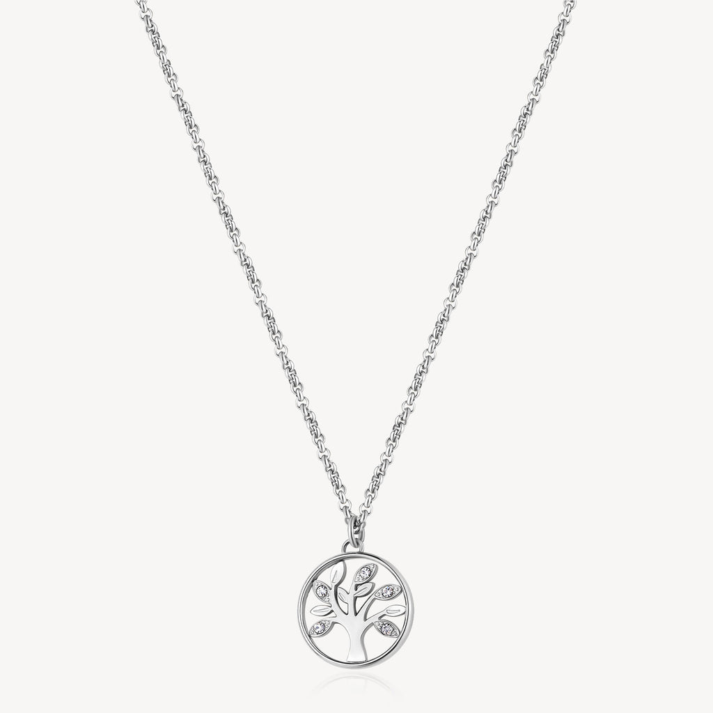 316L stainless steel necklace with tree of life shaped pendant and clear crystals.